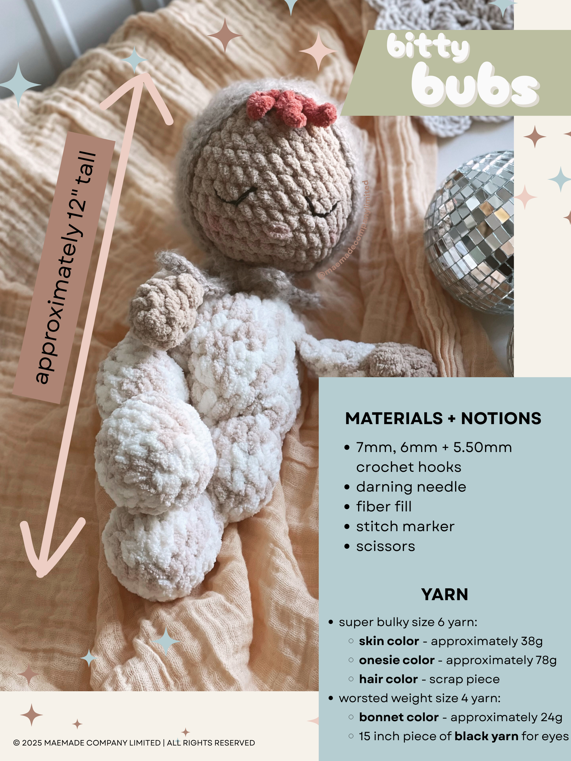 Get the best of both worlds with the bub bundle! These squishy bubs are the coziest project you’ll ever put your hook into. With chubby legs, a sweet bonnet, and a snuggly snoozing face, these little dolls are basically a nap in yarn form. Bubs measures approximately 14 inches tall, and bitty bubs measures approximately 12 inches tall - they’re just the right size for hugging, gifting, or displaying proudly as your handmade cutie.